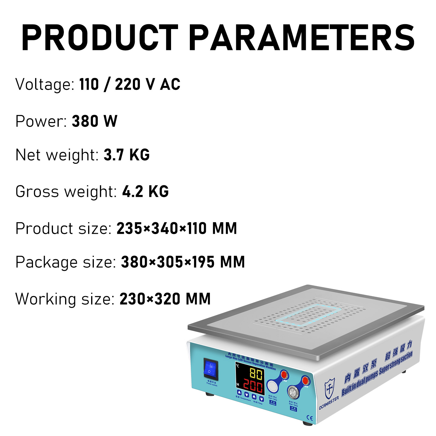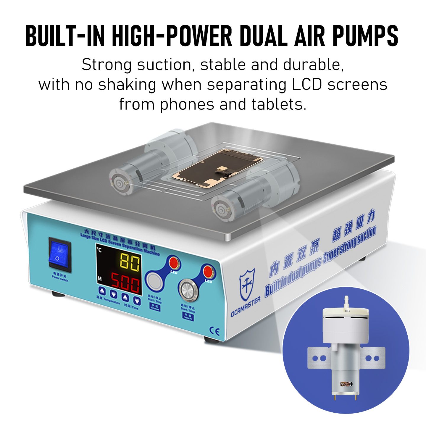 ● Built in dual air pump, dual suction mode, strong suction, fast heating,uniform and precise temperature.